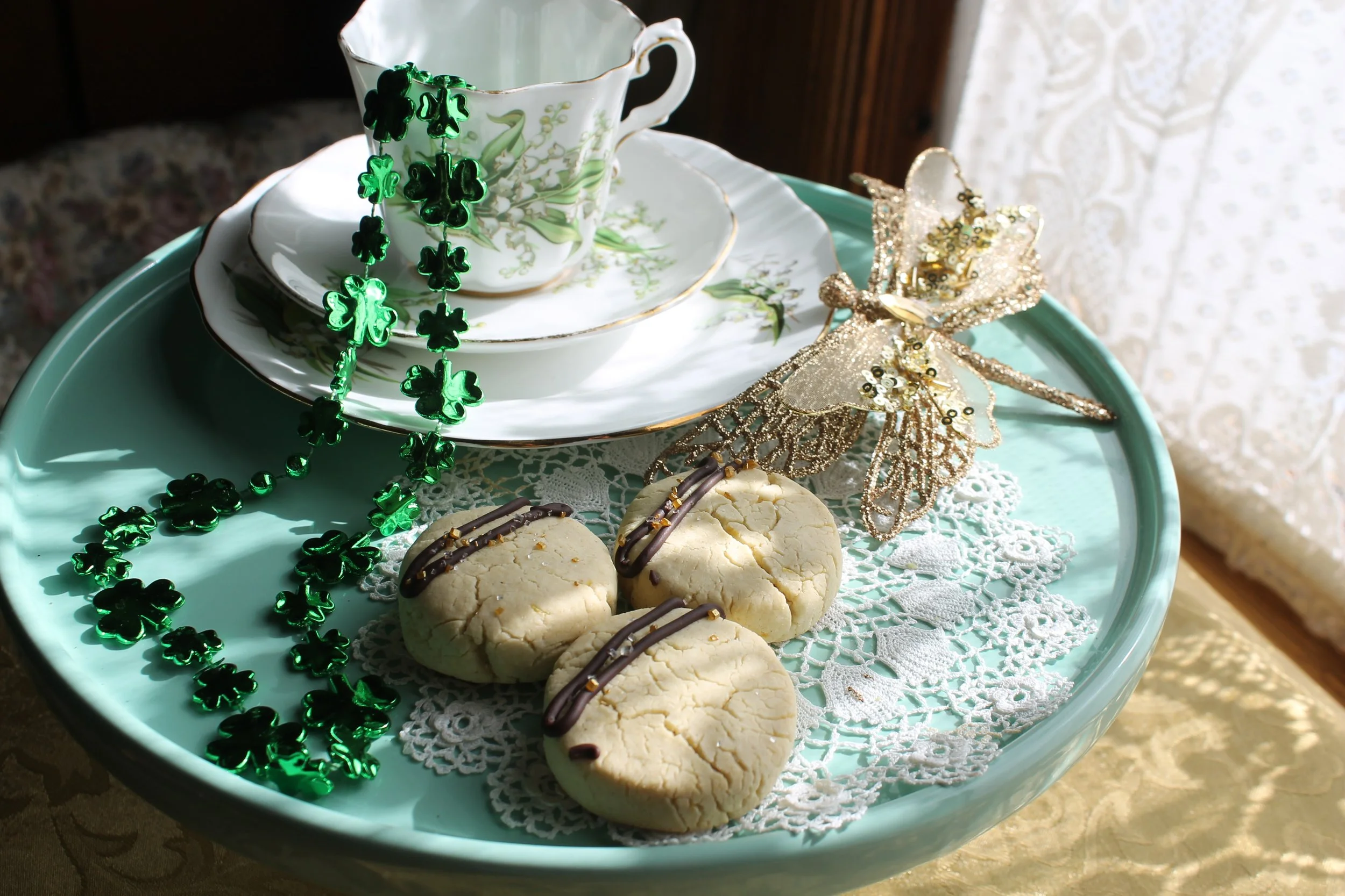 Real fine bone china graces the table. A delicate teacup, saucer, lunch plate, a small knife and spoon is at each place seating. These cutlery pieces are not etiquette accurate, but I thought them so adorable and perfect that I just had to have them on my afternoon tea tables. A linen napkin will be set on the table to the left of your plate as well. Ice water, condiments and cream and sugar may also be waiting on the table. Occasionally we have fun with ice cubes. We enjoy slicing lemon or lime adding mint to the ice cube tray. Many guests have commented in favour of this lemon mint water.